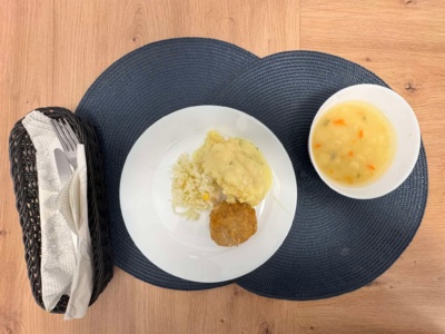 Klopsik pieczony(1, 2) (100g) w sosie koperkowym, ziemniaki (200g) dukane, surówka meksykańska (100g), zupa krupnik z kaszą jaglaną.