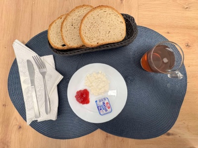 Twaróg(100g, 3), dżem niskosłodzony, masło(15g, 3), pieczywo mieszane(110g, 2), herbata(250ml).