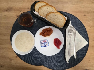 Owsianka na mleku(400ml, 2, 3), dżem niskosłodzony, paprykarz warzywny(100g) masło(15g, 3), pieczywo mieszane(110g, 2), herbata(250ml).