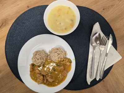 Wieprzowina duszona (100g) w sosie z cukinią, kasza jęczmienna(2) (180g), zupa kalafiorowa(4).