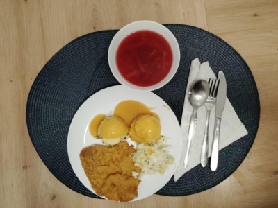 Kotlet schabowy(1, 2) (100g), ziemniaki (200g) dukane z koperkiem, surówka z kapusty białej i kukurydzy (100g), zupa barszcz czerwony z makaronem(2)