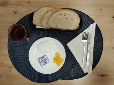 Twaróg(100g, 3), dżem niskosłodzony, masło(10g, 3), pieczywo mieszane(110g, 2), herbata(250ml)