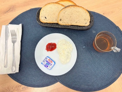 Twaróg(100g, 3), dżem niskosłodzony, masło(10g, 3), pieczywo mieszane(110g, 2), herbata(250ml).