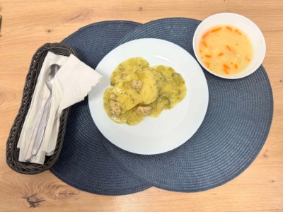 Kawałki kurczaka (100g) w sosie brokułowym, ziemniaki (200g) dukane z koperkiem, zupa krupnik z kaszą jaglaną.