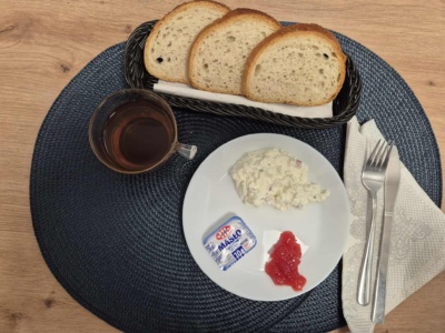 Twaróg(100g, 3) z rzodkiewką i szczypiorkiem, dżem niskosłodzony, masło(10g, 3), pieczywo mieszane(110g, 2), herbata(250ml)