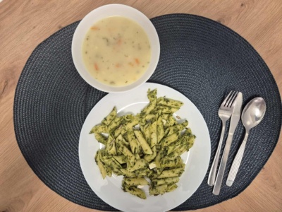 Makaron(2) penne w sosie szpinakowo- śmietanowym(3) z serem typu greckiego(3) (350g), zupa kartoflanka(3)