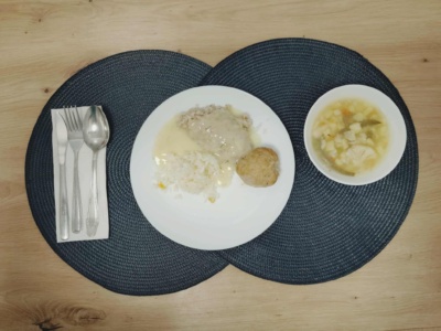 Klopsik pieczony(1, 2) (100g) w sosie koperkowym, kasza jęczmienna(2) (180g), surówka z kapusty białej i papryki (100g), zupa jarzynowa(4)