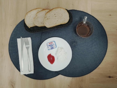 Wędlina(80g), pomidor(40g), rukola(10g), Pasta z pieczonej dyni i suszonych pomidorów(50g), masło(10g, 3), pieczywo mieszane(110g, 2), herbata(250ml).