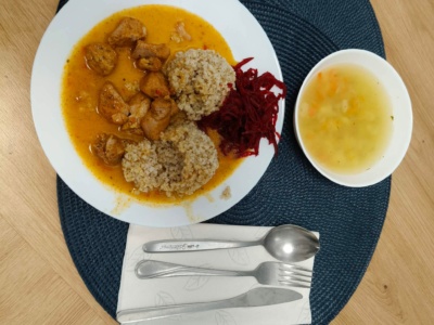 Gulasz wieprzowy (100g), kasza jęczmienna(2) (180g), buraczki (100g) tarte, zupa kapuśniak(4).