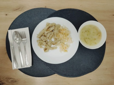 Kluski ziemniaczane(1) z okrasą (300g), surówka z kiszonej kapusty (100g), zupa ogórkowa(3, 4).