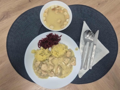 Kawałki kurczaka (100g) duszone w sosie prowansalskim, ziemniaki (200g) dukane z koperkiem, buraczki (100g) gotowane, zupa krem z białych warzyw(3) z grzankami(2).