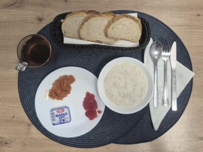 Owsianka na mleku(400ml, 2, 3), dżem niskosłodzony, paprykarz warzywny(100g) masło(10g, 3), pieczywo mieszane(110g, 2), herbata(250ml).