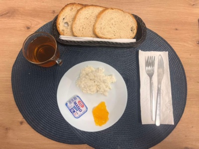 Twaróg(100g, 3), dżem niskosłodzony, masło(10g, 3), pieczywo mieszane(110g, 2), herbata(250ml).