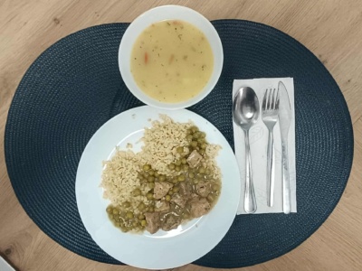 Wieprzowina duszona (100g) z groszkiem zielonym, kasza bulgur(2) (180g), zupa koperkowa(4).