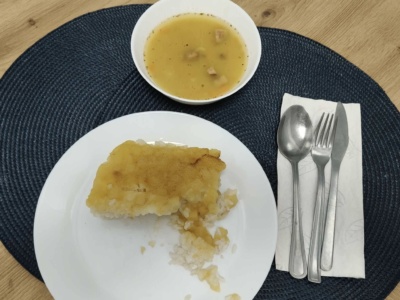 Ryż z jabłkiem (350g) i cynamonem, zupa grochówka z kiełbaską.