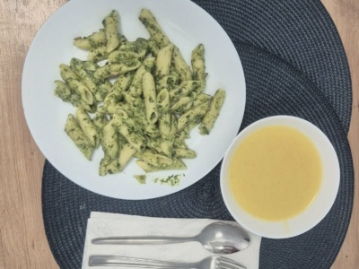 Makaron(2) penne w sosie szpinakowo-śmietanowym(3) z serem typu greckiego(3) (350g), zupa krem z kukurydzy, grzanki(2).