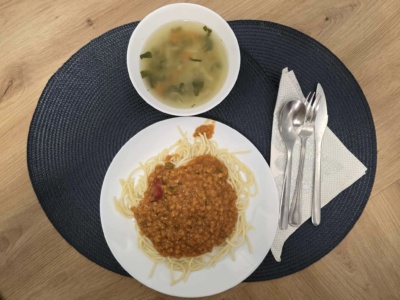 Makaron(2) Spaghetti(2) w sosie paprykowym z soczewicą (3) (350g), zupa szpinakowa z ryżem.
