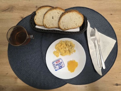 Jajecznica(100g, 1), dżem niskosłodzony, pieczywo mieszane(110g, 2), masło(10g, 3), herbata(250ml).