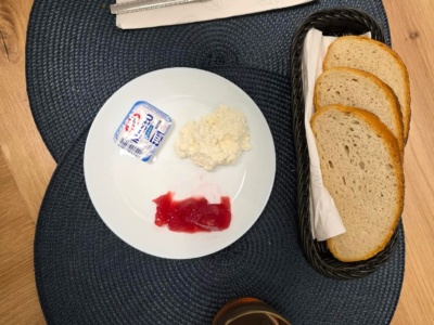 Twaróg(100g, 3), dżem niskosłodzony, masło(10g, 3), pieczywo mieszane(110g, 2), herbata(250ml).