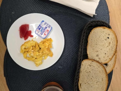 Jajecznica(100g, 1), dżem niskosłodzony, pieczywo mieszane(110g, 2), masło(10g, 3), herbata(250ml).