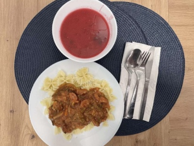 Leczo warzywne z kiełbasą (100g), makaron(2) kokardki (180g), zupa barszcz ukraiński(3, 4).