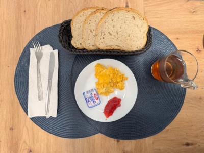 Jajecznica(100g, 1), dżem niskosłodzony, pieczywo mieszane(110g, 2), masło(10g, 3), herbata(250ml).