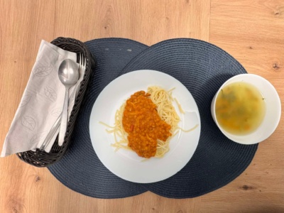 Makaron(2) Spaghetti(2) w sosie paprykowym z soczewicą (3)(350g), zupa szpinakowa z ryżem.