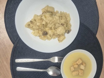 Łazanki(2) z kapustą, pieczarkami i kiełbasą (350g), zupa krem z białych warzyw(3) z grzankami(2).