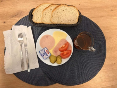 Wędlina(80g), ser żółty(35g, 3), pomidor(40g), ogórek kiszony(30g), masło(10g, 3), pieczywo mieszane(110g, 2), herbata(250ml).
