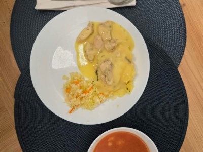 Kawałki kurczaka (100g) duszone w sosie prowansalskim, ziemniaki (200g) dukane z koperkiem, surówka z kapusty białej z marchewką (100g), zupa pomidorowa z lanymi kluseczkami(2, 4).